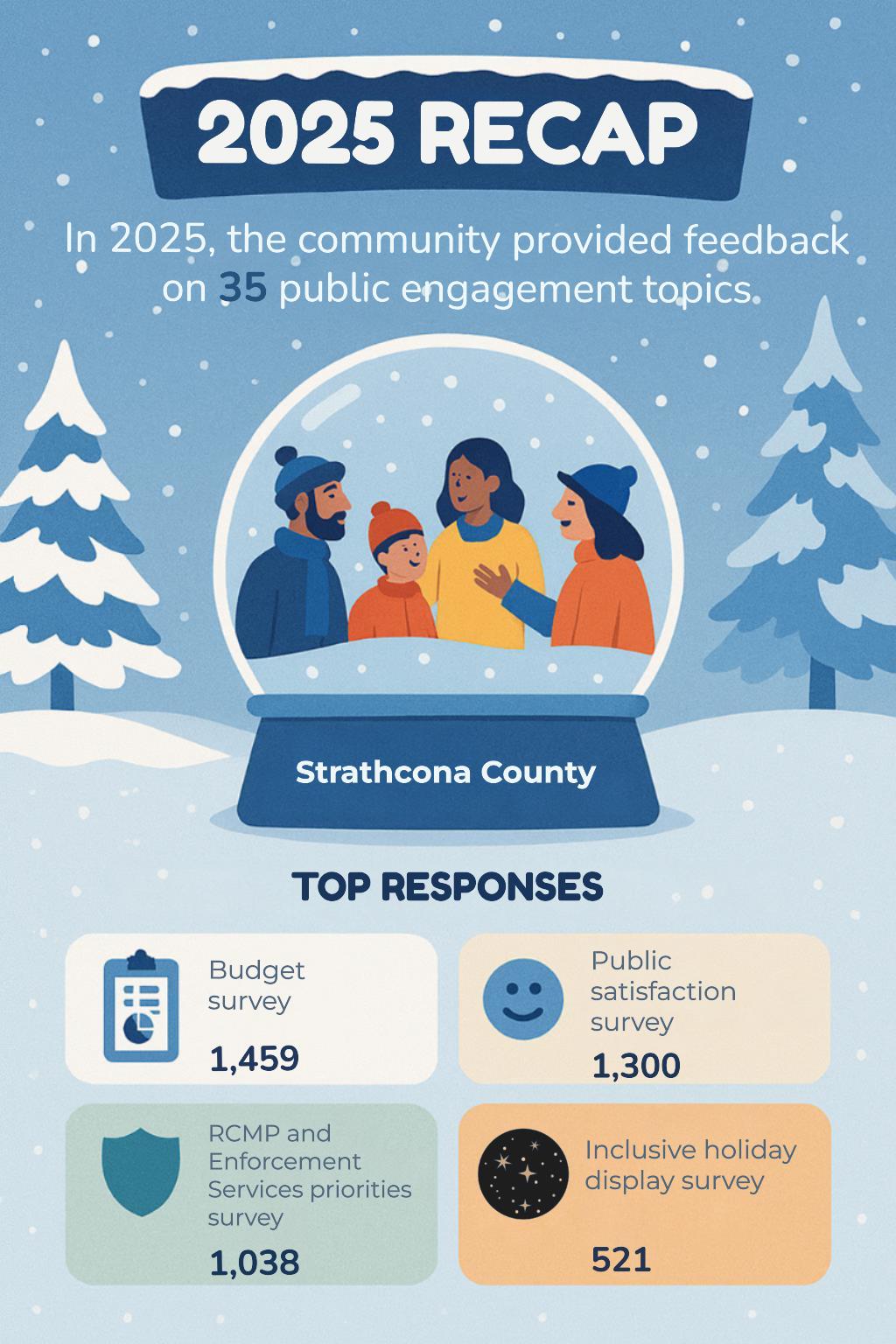 We appreciated hearing feedback on 35 public engagement topics, with the most responses tied to the budget, public satisfaction, RCMP and Enforcement Services priorities and the inclusive holiday display surveys.